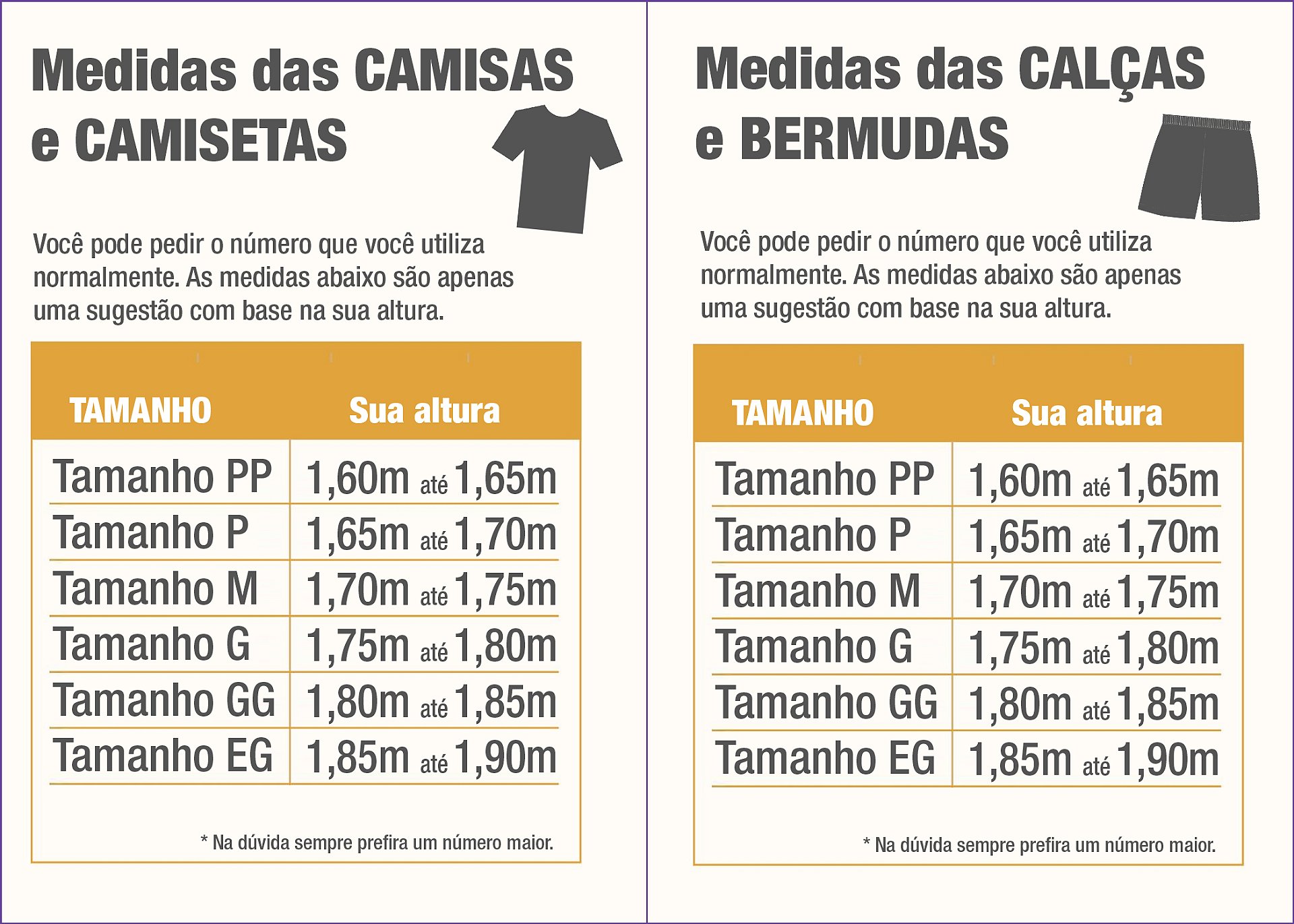 Aqui embaixo você vai encontrar as tabelas de medidas pra camisetas, calças, bermudas, tênis e muito mais. Siga as instruções de medição, compare com a tabela e escolha o tamanho que mais combina com você.